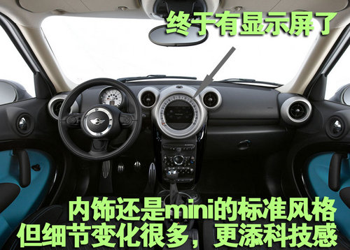 也許有些朋友會抱怨:mini的內(nèi)飾的確個(gè)性,但是除了一副自動空調(diào)之外居然沒有時(shí)下最為流行的車載顯示屏。而我們通過這款最新的Countryman就看到了一些希望,在整體上依然是我們所熟悉的mini內(nèi)飾之外,中控臺中央最明顯的變化就是那塊彩色顯示屏。