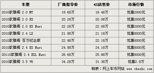 新雅閣一直是日系中級(jí)車(chē)型的典型代表,新雅閣憑借其大氣的外觀、舒適的空間和豪華的配置在中級(jí)轎車(chē)市場(chǎng)中占據(jù)了一席之地。去年,廣汽本田又對(duì)第8代雅閣進(jìn)行了小改款,對(duì)原來(lái)車(chē)型的配置有一定程度提升,部分車(chē)型增加了智能鑰匙和后遮陽(yáng)板等,提高了雅閣整體車(chē)型的性價(jià)比。近日根據(jù)網(wǎng)上車(chē)市價(jià)格監(jiān)測(cè)系統(tǒng)顯示,目前雅閣全系最高優(yōu)惠近3萬(wàn)元,2.4L現(xiàn)車(chē)較齊全。具體價(jià)格以及優(yōu)惠幅度如下: