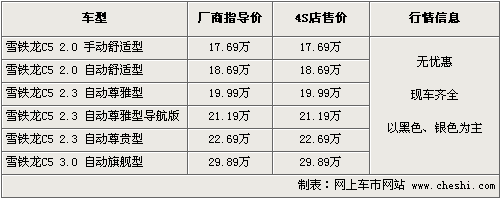 東風雪鐵龍C5秉承了雪鐵龍先進的創新理念和完美的制造工藝,從外觀到內飾的做工充分體現了這款中級車的內在價值。同時一系列高端配置以及車身安全性方面均有不俗的表現。根據網上車市價格監測系統顯示,目前C5全系都有現車供應,車價方面無任何優惠。