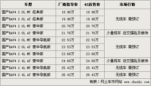 豐田RAV4是一汽豐田生產(chǎn)的一款城市SUV,它配置了主動(dòng)扭矩分配控制四輪驅(qū)動(dòng)系統(tǒng),同時(shí)兼?zhèn)湓诔鞘械缆泛驮揭奥范蔚膬?yōu)異行駛性能。該車上市后便引來(lái)了購(gòu)買風(fēng)潮,并且一直持續(xù)加價(jià)銷售。但由于油門(mén)踏板存在缺陷的召回事件,目前RAV4反而有了部分優(yōu)惠的幅度,購(gòu)車可獲贈(zèng)交強(qiáng)險(xiǎn)及千元裝飾。具體車型行情如下: