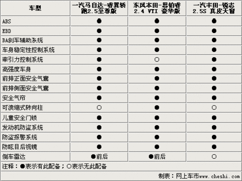 隨著汽車市場的日益成熟,安全能力逐漸也成為了車主最為關(guān)心的問題。可以看出ABS+EBD和6安全氣囊均成為了這三款車型的標(biāo)準(zhǔn)配置。但仔細(xì)看下來,睿翼轎跑和思鉑睿的配置還是更加的全面,在配備后倒車?yán)走_(dá)同時還配備了前部停車?yán)走_(dá),,進(jìn)一步保證停車時的安全。值得一提的是這三款車型都配備了車輛行駛動態(tài)控制系統(tǒng),該項配置可以大大的降低車輛行駛中,因側(cè)滑而發(fā)生的事故,尤其是睿翼轎跑和銳志還配備了牽引力控制系統(tǒng)。在細(xì)節(jié)方面三款車同樣十分到位,都配備的后排兒童安全門鎖、防眩目后視鏡等。