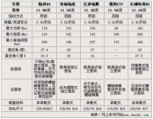 首先,作為一款SUV,人們除了關(guān)注他們的基本信息外,更看重的就是它實際的通過性和操控性。通過上表我們可以看到,除了獵豹CS7,其他4款車型的離地間隙都處于一個比較優(yōu)秀的水平上,這為人們?nèi)粘3鲂薪加危樌ㄟ^略微惡略的路況提供了保障。另外,值得一提的就是5款SUV的底盤結(jié)構(gòu),瑞虎、瑞鷹和CS7三款都采用了中規(guī)中矩的承載式設(shè)計,而陸風(fēng)X8和哈弗H5則采用了純正的越野車底盤設(shè)計-非承載式,讓車輛在越野路況也可以更順暢的通過。
