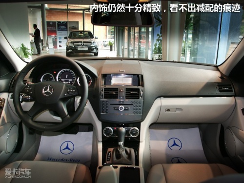 打開車門,我沒有看到粗糙的做工和廉價的用料,整車內飾仍然十分細致。通過車內閃閃發光的鍍鉻裝飾與精良的做工能感受到奔馳一絲不茍的造車品質。車內的減配在不容易察覺的地方,例如座椅電加熱功能被省略,座椅的電動調節也從車門處移到座椅下。自動防眩后視鏡也被減配為手動調節。