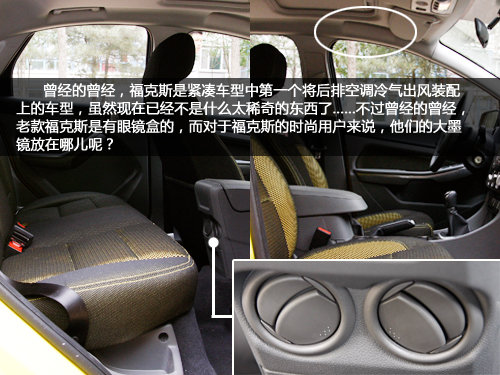 福克斯是國內第一款在后排加裝空調出風口的緊湊型轎車,雖然在現在已經不是什么大不了的設置,但是貼心的設計還是不錯的。不過沒有眼鏡盒是讓編輯我這個四眼感覺很不爽的,畢竟老款福克斯是帶有眼鏡盒的。