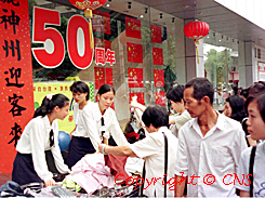 國慶節(jié)期間七天的假期對于中國內(nèi)地的許多商家來說可謂商機多多,福州閩臺商行的售貨小姐將服裝擺到店門口以方便顧客挑選。