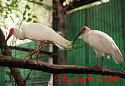 朱(擐右側加鳥)是中國最瀕危的野生動物,全世界僅存二百只左右,堪稱世界珍寶。北京動物園從八十年代中期試驗人工飼養繁殖,目前已發展到二十二只。其中十四歲的青青(左)和"丈夫"平平十年來年年產卵繁殖后代,對延襲朱(擐右側加鳥)家族貢獻巨大。
