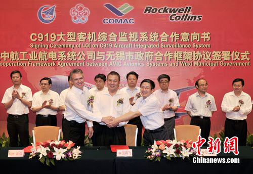 中新網無錫7月8日電(記者 孫權)中國商用飛機有限責任公司、中航工業雷達與電子設備研究院和美國羅克韋爾柯林斯公司三方今日在無錫“握手”,確定國產C919大型客機綜合監視系統的研制生產項目落戶無錫市濱湖區。幾年后,裝備“無錫造”綜合監視系統的C919大型客機,將翱翔在中國的藍天,并飛行在世界各地。