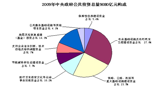 此外,2009年中央政府公共投資預算總量為9080億元,比上年增加4875億元,分項目安排情況如下:用于保障性住房建設資金493億元,占5.4%;農業(yè)基礎設施及農村民生工程建設資金2522億元,占27.8%;鐵路、公路、機場等重大基礎設施建設資金2134億元,占23.5%;醫(yī)療衛(wèi)生教育文化等社會事業(yè)發(fā)展資金926億元,占10.2%;節(jié)能減排和生態(tài)建設資金696億元,占7.7%;支持企業(yè)自主創(chuàng)新、技術改造及結構調整資金633億元,占7.0%;地震災后恢復重建(基金)投資1300億元,占14.3%;公共服務基礎設施等其他項目資金376億元,占4.1%。