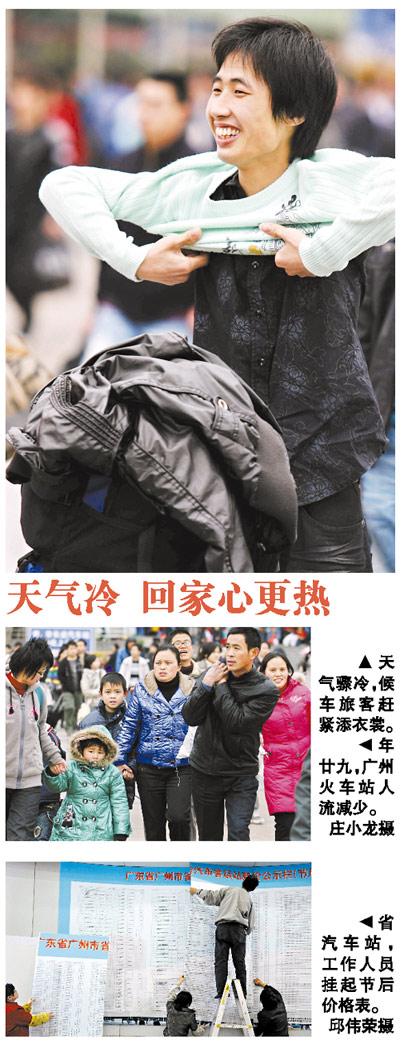 記者昨日在廣州火車站看到,廣場上仍有不少拉著行李準備返鄉過春節的末班車,不過,相比前日密密麻麻的人流,昨日已經好多了,記者采訪了下午1時乘坐火車的黃為民,他告訴記者,從到火車站公交站,再驗票進站,總共花了不到10分鐘。在廣州火車站廣場上設置的24小時候車區也已經撤掉。