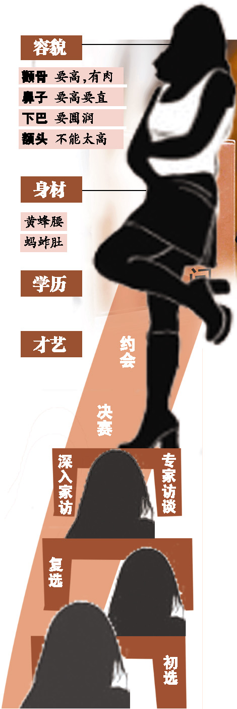 除了形象和心理測試,美女們還得過“面相關”。記者在現場看到,美女們經過一關又一關甄選后,會來到“面相顧問”的房間,接受“來自香港的相學專家”的評判。“顴骨要高,有肉;鼻子要高要直;下巴要圓潤;額頭不能太高。旺夫相大體就這個標準。”這位“相學專家”表示,如果各方面條件都優秀,但面相不符合要求,也會被淘汰出局。