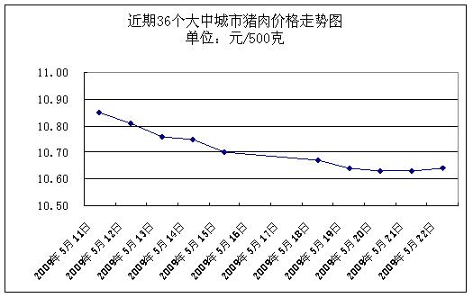 中新網5月25日電 據國家發改委網站消息,據國家發展改革委價格監測中心監測,上周(2009.5.18-2009.5.22,下同)36個大中城市集市、超市豬肉(精瘦肉)平均零售價格每500克為10.64元,與前一周(2009.5.11-2009.5.15,下同)相比下降1.21%。