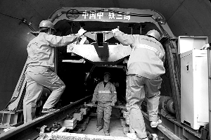“目前的鋪軌技術是國內最先進的,25米的鋼軌在地面形成軌排,然后機械下到地下進行鋪裝!敝需F一局軌道項目經理表示,目前一個基地每天的鋪軌進度是150米!28公里的軌道線上,8.5公里路段采用了減震處理。”該負責人表示,4號線是北京減震處理最多的一條地鐵。