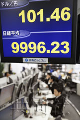 電子牌顯示日經(jīng)指數(shù)跌破1萬點關口,美元兌日元比價升至101上方。7日上午9點18分攝于東京東新橋的外匯.COM。(共同社)