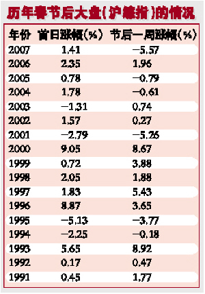 統(tǒng)計(jì)還顯示,從1991年春節(jié)以來的17年中,只有4年春節(jié)后首個(gè)交易日市場(chǎng)沒有“開門紅”,分別是1994年、1995年、2001年、2003年。另外有13年,春節(jié)后首個(gè)交易日大盤均出現(xiàn)不同程度的上漲,占統(tǒng)計(jì)樣本的近80%。(見表)