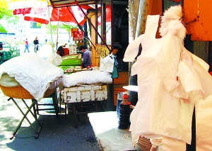 食品市場對面,幾家批發塑料制品的小鋪挨在一起。問及“限塑”之后生意有什么變化?店家的答案是:超薄的小袋兒沒有了,但其他袋子的出貨量并沒減少,生意跟以前差不多。