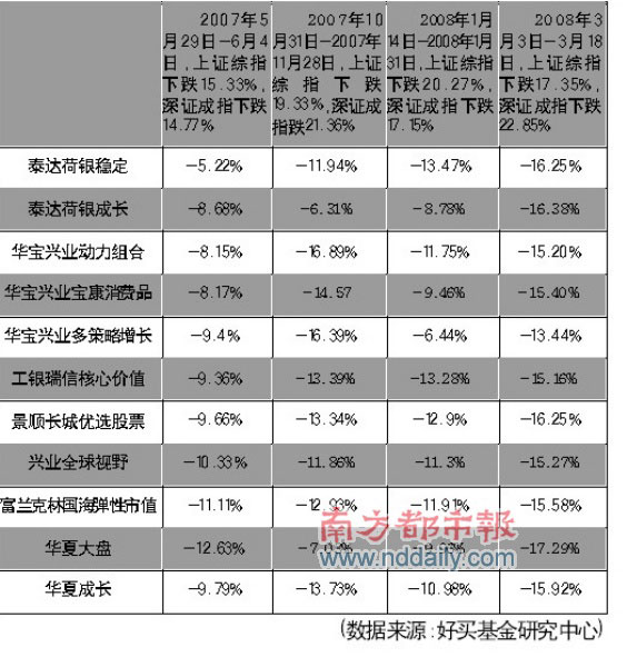 3月份以來,受到股市拖累的股票型基金,凈值下跌最少的也有10%,最多損失超過24%.然而同樣是凈值縮水,今年以來績優與績差基金之間的差距居然高達30%,尋找抗跌的基金已經成為今年基金投資的一個主要命題。好買基金研究中心樂嘉慶指出,從去年5月底至今,股市共經歷了4個跌幅超過15%的階段。在4個階段中比較抗跌的基金表現出兩大特點,一是行業投資比較均衡的基金,另一個則是規模適中,倉位調整迅速的基金。