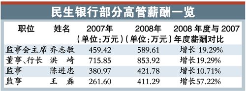 不過,董事、副行長洪崎在眾高管降薪中獨(dú)樹一幟,升職加薪。去年薪酬達(dá)853.92萬元,比上年增長138.07萬元,“因工作原因職級(jí)調(diào)整,2008年薪酬比照行長執(zhí)行。”民生銀行在年報(bào)中解釋。