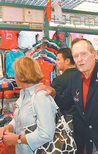 18號(hào)攤主用英語推薦中國的手繡龍鳳睡袍。老布什和女兒一起挑了6件手繡睡袍。買完睡袍,老布什笑問還有什么要求,兩位中國姑娘毫不猶豫地說:“我們想與您一起照相。”老布什欣然答應(yīng)。