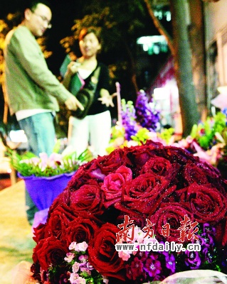 記者在該花店看到,19支紅玫瑰、一支黃天霸百合,再加一些桔梗花、滿天星陪襯,價格就是280元。而元宵節,也就是“中國情人節”時,這一“套餐”的價格只是180元。“價格確實比前兩天上漲了不少。”該店店員說,一支普通的國產玫瑰,平常的價格是2—3元,元宵節期間要5—6元,到情人節,就變成了10—15元。“一方面是因為進貨貴,另一方面是因為西方情人節對情侶們更具有吸引力,鮮花的銷量比平常要好很多,我們不怕有價無市。”花店老板娘說,昨天該花店就接受了一名顧客預定的99朵玫瑰花束,價格1200元。