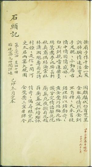 己卯本存四十一回又兩個半回,此本在31-40回的總目后寫有“脂硯齋凡四閱評過”、“己卯冬月定本”字樣,故稱。“己卯”為乾隆二十四年(1759),此紀年應是此本底本的紀年,現存為過錄本。在這個過錄本上,有700余條雙行小字批語,另據此本上“祥”、“曉”字的避諱,研究者比對《怡府書目》,考定此本為怡親王允祥、弘曉府上的抄藏本,聯系到雍正二年御批中曾有“你(指曹頫,雪芹之父或叔父)是奉旨交與怡親王傳奏你的事的……”可知怡親王府與曹家的特殊關系,此本的底本或許就來自曹家,其價值可想而知。己卯本第1-20回、31-40回、61-70回(內64、67兩回由后人補抄)原由董康、陶洙所藏,現藏國家圖書館;第55回下半至第59回上半現藏國家博物館。