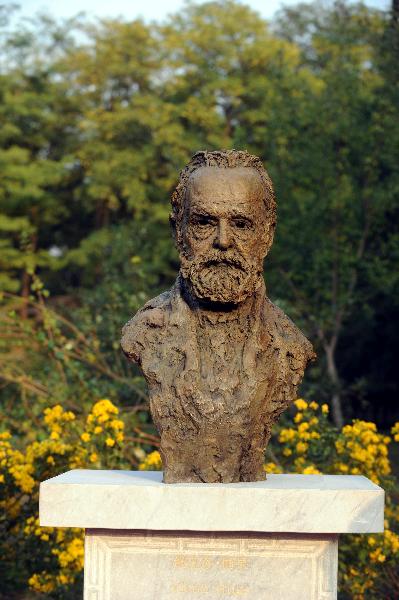 這是10月16日拍攝的雨果雕像。 10月16日,為紀念圓明園罹劫150周年,圓明園舉行雨果雕像揭幕儀式,青銅質(zhì)地的雨果半身雕像正式與游人見面。雕像高84厘米,寬50厘米,重90公斤,位于大水法遺址東側(cè),在底座上用中法文字鐫刻了說明詞,表達了“永久呼喚文明與和平的尊重,永久紀念人類的正義與良心”的愿望。在雕像南側(cè)書型石雕上鐫刻著雨果強烈譴責(zé)1860年英法聯(lián)軍洗劫圓明園暴行的《致巴特勒上尉的信》。雕像由法中友好聯(lián)合會、中國人民對外友好協(xié)會和法國東方華人協(xié)會共同捐贈,法國雕塑家娜什拉·凱努制作。新華社記者羅曉光攝