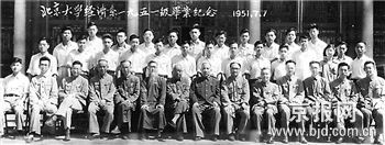 一個月后,我所在的經濟系四年級同學即將畢業。大家懷著對新上任的馬校長和全系教師依依不舍的惜別之情,提出邀請馬校長和全系教師同我們一起合影。7月1日,在孑民堂前,中國照相館的高級技師為我們精心地拍攝了一張畢業紀念照。在北大一百周年校慶舉辦的校史展覽會上和新成立的校史館里,都將這張照片放大展出,十分引人注目。