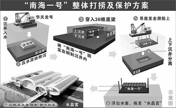 魏峻說,由于“南海一號”所在海域的海水能見度幾乎為零,水太深,采用傳統的水下考古方法,將無法對沉船和船載文物進行準確的測繪和記錄,必然會造成不少珍貴文物考古信息的丟失。古沉船在水下浸泡了800多年,船體非常脆弱,即使船載文物全部打撈出水,對于沉船本身的水下考古打撈也將會是一件非常困難的工作。因此,經多方面專家的反復論證和研究,決定對“南海一號”沉船進行整體打撈:將沉船、載物與其周圍泥沙按照原狀固定在特殊的鋼制沉箱內,將分散、易碎的文物一體化、一次性吊浮起運,然后遷移到能人為控制環境、保護較好的“水晶宮”中進行科學的水下考古發掘。