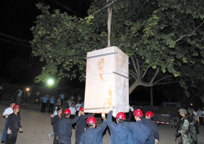昨日記者獲悉,南京大報(bào)恩寺“謎中之謎”——地宮鐵函在眾多持槍武警的護(hù)衛(wèi)下,于27日晚起吊出地宮,運(yùn)回南京市博物館。南京博物院文物保護(hù)專家奚三彩、中國考古學(xué)會(huì)理事長徐蘋芳等國內(nèi)專家已陸續(xù)到來,近期將集體對(duì)神秘鐵函的開啟制定出方案。