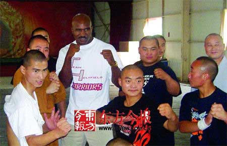 昨天上午9點半,曾經4次戴上拳王金腰帶、在與泰森比賽時被后者咬掉右邊耳朵的美國拳王霍利菲爾德慕名來到少林寺,不僅一睹少林真功夫,還向少林寺方丈討教了不少練功的方法。