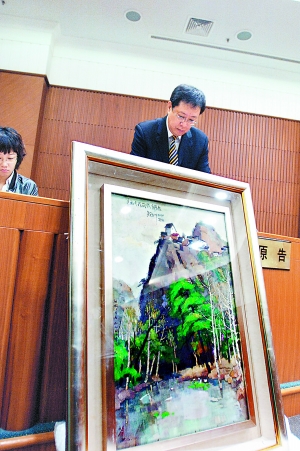 “快看,肯定是那幅畫。”上午9時,在旁聽人群的一陣騷動聲中,用塑料薄膜包裹著的大方框被抬進一中院的法庭。金茂律師事務所的王建軼律師打開包裝,一幅油畫展現在眾人面前。“這是幅假畫。”王建軼律師說,他的委托人蘇敏羅以230萬元的價格從北京翰海拍賣有限公司拍得這幅畫,而此畫當時被介紹為吳冠中的作品。