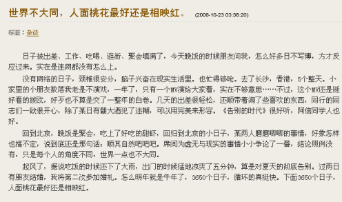 中新網10月23日電 今天凌晨中國女星徐靜蕾更新了自己曾號稱“第一博客”的博客,不過,在這篇題為“世界不大同,人面桃花最好還是相映紅”的文章中卻出現硬傷,將一個十二生肖循環算成了十年的3650天。有網友回帖對此提出質疑,認為其數典忘祖。