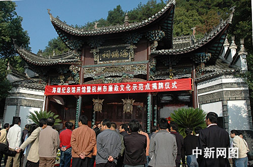 中新網杭州10月29日電(記者龔讀法 實習生鮑婷婷)明代著名政治家海瑞剛正不阿,居官清廉,其故事一直傳頌至今。1558年,45歲的海瑞升任浙江杭州淳安知縣,2008年恰好是450周年。10月28日上午,海瑞紀念館開館儀式在淳安縣千島湖隆重舉行,同時,海瑞紀念館被列入“杭州市廉政文化的示范點”。