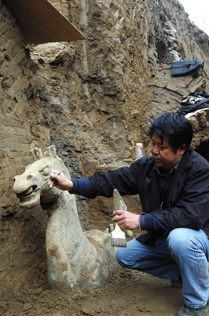 考古人員正在發掘、清理青銅馬。