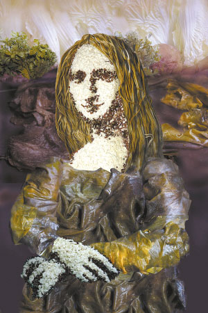 桔多淇1996年畢業(yè)于川美,學(xué)的是美術(shù)設(shè)計。這位家在謝家灣的重慶女孩兒,曾在黃桷坪當(dāng)過“黃漂”,隨后,又成了“北漂”。讓她一夜成名的,是她最近在北京舉行的名為“蔬菜博物館”攝影個展,在這次展覽上,《最后的晚餐》的餐桌變成了一塊巨大的豆腐,尤大等一干人則是用生姜制成。而《蒙娜麗莎》更是豆腐當(dāng)臉,海帶當(dāng)頭發(fā),紫菜做衣服,看上去很有意思。而這些攝影作品的素材,都是桔多淇親手制作。桔多淇在畫展上展出的都是以這些素材為元素的攝影作品,“每一件我只做了12張照片,小尺寸的畫廊定價為1880美元,大尺寸的要賣2888美元,在開展的第一天,賣出了兩幅小尺寸的。”