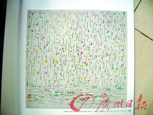 在清華大學美術學院的展廳里,陳列著滿滿兩大展區的纖維藝術作品。走進展示區,著名畫家吳冠中的作品《雨花江》呈現在眼前。在色彩柔和的天空中,飄落下點點雨滴,還有黃色、桃紅色、綠色片片色彩鮮艷的花瓣和樹葉,雨滴和花瓣打著圈飄落下來落入江中,在水面上激出一圈圈美麗的漣漪。整幅作品營造出柔和的意境,不過,這可不是吳冠中先生真正的畫作,而吳冠中先生根據自己的名畫《雨花江》用羊毛織成的,作品名稱也叫《雨花江》。