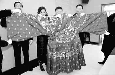 18條五彩龍、540只仙鶴、540個(gè)靈芝、1045個(gè)金色正楷壽字……南京云錦研究所歷時(shí)3年,完全按照明定陵出土原件復(fù)制成功的“織錦金壽字龍?jiān)萍缤ㄐ潺堃[妝花緞襯褶袍”,日前正式移交給定陵博物館(見圖)。復(fù)制成功的龍袍通體為絳紅色,上面滿是彩色圖案紋飾,顯得非常華貴精美。
