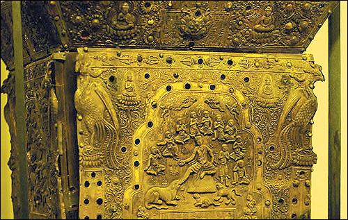 記者了解到,塔王被請(qǐng)出后的第一件事就是“擦澡”,專(zhuān)家用蒸餾水、棉花在塔王的表面一點(diǎn)點(diǎn)地擦洗,如今,凡是見(jiàn)過(guò)它的專(zhuān)家都會(huì)驚艷,去除蒙塵的塔王散發(fā)出金色的光澤,表面布滿了大大小小的雕刻圖案,如果加上20多幅故事圖畫(huà)上的人物,阿育王塔佛像人物像共超過(guò)了100個(gè),舉世罕見(jiàn)。其中,佛祖釋迦牟尼生平故事以連環(huán)畫(huà)的形式雕刻在8片山花蕉葉上,每片上有2-3個(gè)故事,共約20幅圖案分別描述了六牙白象入夢(mèng)、佛祖誕生、菩提樹(shù)下證道、佛祖涅槃等20個(gè)故事。