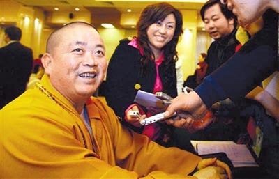 3月11日下午,全國人大代表河南團向媒體開放。會議之初,釋大師出門上洗手間,被各路記者圍住,隨后在工作人員“保護”下“突圍”。會議后半段,釋永信夾著公文包準(zhǔn)備提前離會,沒曾想再一次被眼尖的記者們圍堵,釋大師嘟噥了一句“早知道應(yīng)該早點走啊”,他再一次被工作人員“遣返”會場。