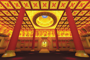 走進展覽大廳,正中間就是出土于南京大報恩寺遺址名揚四海的七寶鎏金阿育王塔的主展區,設計師用“天圓地方”來形容他對核心之處的設計理念。崇圣殿的大廳內從地面到屋頂估計有9米高,記者看見施工單位搭起了3層高的腳手架,幾名工人正在為圓頂上色,“圓頂共制作了三圈,最大的一圈直徑2.4米,一圈比一圈縮小,這樣可以體現出一種神秘的層次感。18幅飛天壁畫盤旋在圓頂周邊,最高一圈內畫上藍色的夜空,然后安裝LD最新燈光系統,16盞射燈對應的地方是方形的仿漢白玉基座,座上四邊是進口的鋼制廊桿。”記者最關心的是基座上究竟陳列什么文物?無疑是大家都想要看到的,美麗無比的七寶鎏金阿育王塔。