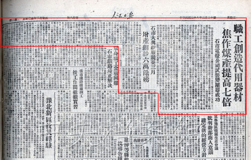 3. 1949年3月30日,《人民日報》關于焦作煤產提高七倍及石市紗廠增產細紗六萬余磅的報道