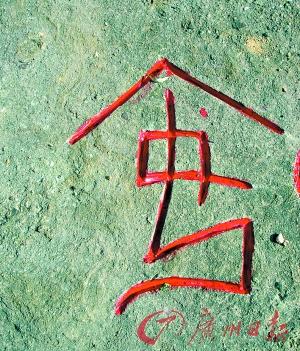 在這些甲骨文中最大的一個字有1平方米那么大,最小的一個字有20cm×30cm那么大,光一個“日”字就有九種寫法,“月”字也有六種寫法,有不少甲骨文字是象形的看起來很形象生動。荊鴻說:“我從去年6月份開始雕刻,花了4個月的時間才完成,現在想想覺得很有成就感!边@些甲骨文被雕刻完成之后,荊鴻和他的學生又把這些字刷成紅色,遠遠望去,這些甲骨文既有藝術感又富含文化底蘊。