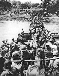與此同時,偵察分隊報告日軍師團指揮部,盟軍工兵正在達羅以北山區日夜開辟公路,并沿途加固橋梁。1月28日晨,濃霧剛剛散去,從新背洋起飛的大機群就開始對日軍達羅陣地實施猛烈轟炸。由270輛坦克和90輛裝甲車組成的強大的機械化縱隊沿著達羅河谷快速推進,發動機的咆哮好像經久不息的雷聲在空曠的河谷中震蕩。很快,鋼鐵洪流的前鋒就好像一把尖刀插進敵人陣地,撕裂敵人防線,然后掩護步兵反復砍殺,并不失時機向敵人縱深突進。