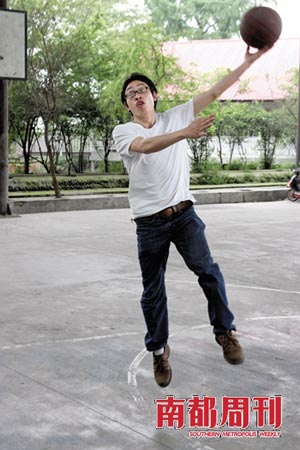 4月23日,范美忠?guī)в浾呋毓鈦喼袑W(xué)。穿著短袖衣服的他,就像一個(gè)剛下宿舍的大學(xué)生,在校門附近的籃球場打起了籃球。光亞幼兒園的小朋友正在場地的另一邊玩游戲,喇叭開得很大聲,而他似乎什么都看不見,聽不到,照樣小跑,上籃,跳投。