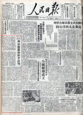 4月1日,由張治中、邵力子、黃紹竑、章士釗、李蒸、劉斐組成的南京國民黨政府談判代表團到達北平,周恩來等設宴招待。以周恩來為首席代表,林伯渠、林彪、葉劍英、李維漢、聶榮臻為成員的中共代表團,開始與國民黨代表團舉行和平談判。4月15日,形成八條二十四款的《國內和平協定》。但結果,南京政府拒絕接受協定,徹底暴露了假和平的真面目。