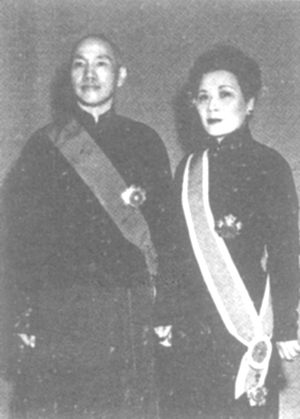 1927年12月1日,蔣介石和宋美齡舉行婚禮。婚禮分兩次進(jìn)行:先在宋宅會(huì)客廳中舉行西式婚禮,后在戈登路大華飯店出席中式婚禮。大華飯店的婚禮在樂曲聲中宣告完成后,蔣介石和宋美齡來到花園攝影。在一系列由中華照相館的師傅拍攝的結(jié)婚照片上,蔣介石穿尖領(lǐng)襯衫、打淺色領(lǐng)帶,配著深色西服,胸口還別著花,宋美齡則身穿淺色旗袍,斜披白紗,頭戴一個(gè)用花蕾編成的小花冠,手捧一束玫瑰。