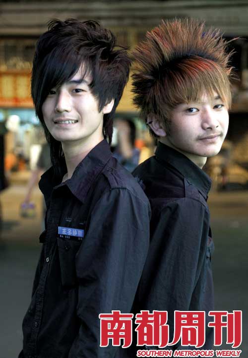 2009年2月,在廣州鷺江村,兩位90后發藝師在炫耀他們創作的新發型。 攝影·吳俊松