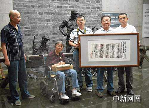 中新網(wǎng)成都7月7日電 (吳志維 楊杰) 今年7月7日是盧溝橋事變72周年紀(jì)念日。7日上午,臺(tái)兒莊滕縣保衛(wèi)戰(zhàn)鄒紹孟之遺腹子鄒汝祥來到建川博物館,將《滕縣保衛(wèi)戰(zhàn)英烈名單》、家書復(fù)制件捐贈(zèng)給該館珍藏。