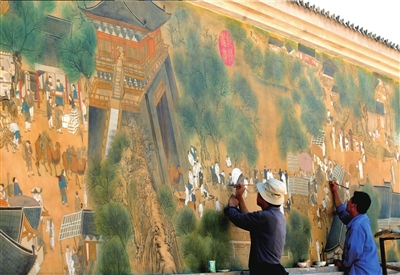 經過近倆月的努力,昨天,在延慶大榆樹鎮奚官營村,一幅由4名農民畫家集體創作的《清明上河圖》壁畫終于落成。村委會表示,將在村里其他角落繪制壁畫,打造“亞洲第一壁畫村”。