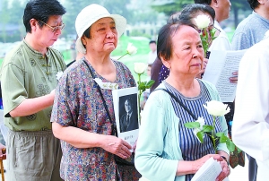 一個月前央視播音員羅京也是在這里與人們告別,和當時的喧鬧相比,山尊老師的追悼會簡單安靜,前來悼念的大約有三四百人,簽到臺上厚厚的兩摞訃告和生平簡介只發出去了一半左右。悼念的隊伍里主要都是白發老人,很少能看見年輕人,這些人都是歐陽山尊藝術界的老朋友。曾與他一起在人藝共事的金雅琴回憶說,山尊熱情直爽、平易近人,可是在工作上誰要做不好,他的脾氣就大。歐陽山尊在中戲任教時惟一帶過的班級,59級導演專業的學生、著名導演曹其敬、白世本也來送恩師最后一程。