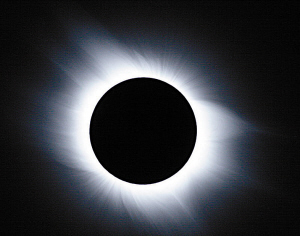一旦太陽被完全遮住,你可以看到日冕的整個光環,它的亮度和滿月差不多。通常,因為藍色的太空你看不到它。